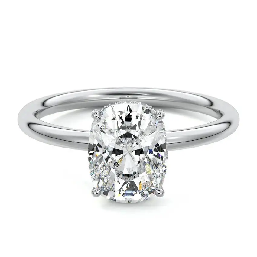 This setting offers a charming twist on the timeless solitaire design. In this setting, the main gemstone takes center stage, while a subtle hidden halo of smaller accent diamonds adds a touch of discreet sparkle and elegance to the ring.
