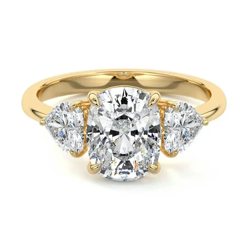 This setting features three prominent stones: a central diamond, symbolizing the love between two individuals, flanked by two smaller heart-shaped diamonds on either side. Each heart-shaped stone is meticulously chosen for its exceptional cut, clarity, and brilliance, and complements the center stone by adding an extra layer of elegance to the design.
